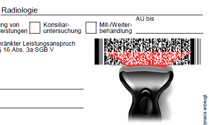 Auf fast allen Blankoformularen ist ein Barcode mit Patienteninformationen aufgedruckt. Mit Hilfe eines 3D-Barcodescanners können diese Daten von PegaMed ausgelesen und verarbeitet werden. Bei Überweisungen, Laboraufträgen und Zytologieaufträgen wird mit dem Einlesen zusätzlich zur Erfassung des Patienten auch gleich noch direkt der entsprechende Überweisungsschein mit den Auftragsdaten erstellt. Das mühsame abtippen der Auftragsdaten vom Papierformular entfällt und beschleunigt so den Praxisablauf.