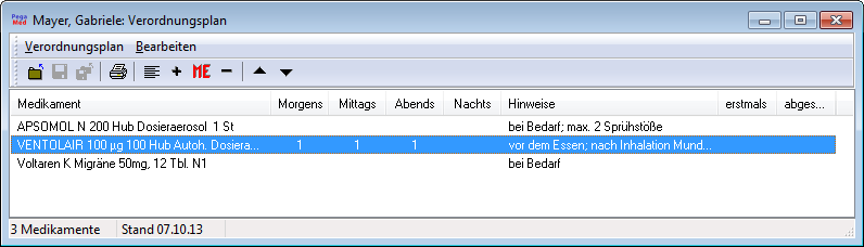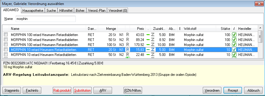 - komfortable Verordnungsauswahl über Name, Hersteller, Wirkstoff aus Ihrer “Hausapotheke”, der ABDA-Datenbank (optional), den bisherigen Verordnungen des Patienten sowie dem Verordnungsplan