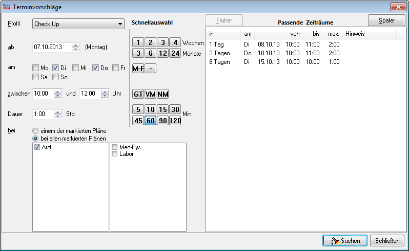 - Suche nach freien Terminen unter Berücksichtigung von Dauer, Wochentag, Uhrzeit usw.
