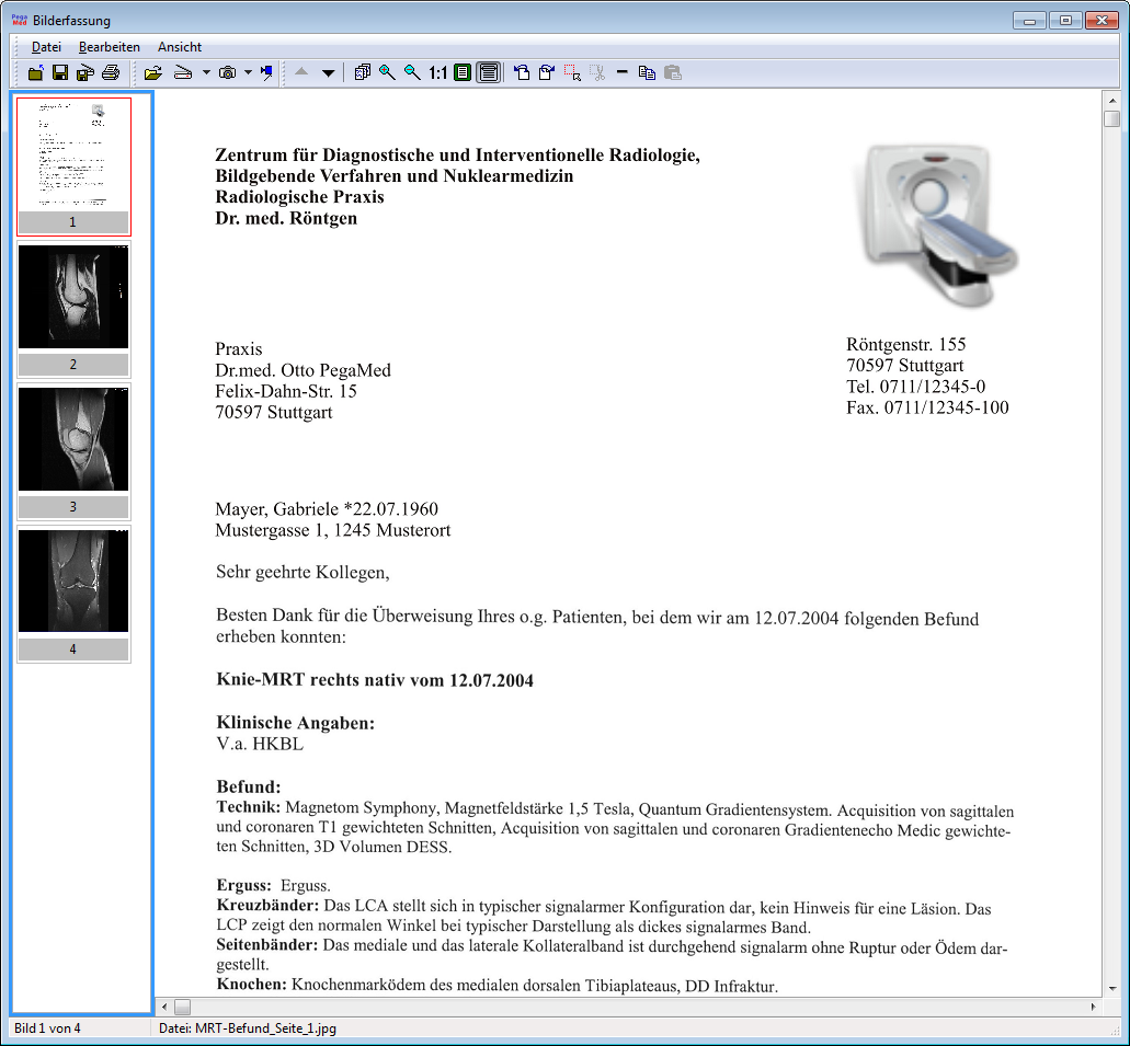 Das Bild- und Dokumentenmanagementsystem Acta in PegaMed gibt Ihnen die Möglichkeit, Ihre Dokumente strukturiert abzulegen und eingehende Dokumente per Scanner direkt einzulagern. Der Anschluss einer Digitalkamera und das Auslesen der Bilder ist selbstverständlich auch möglich.